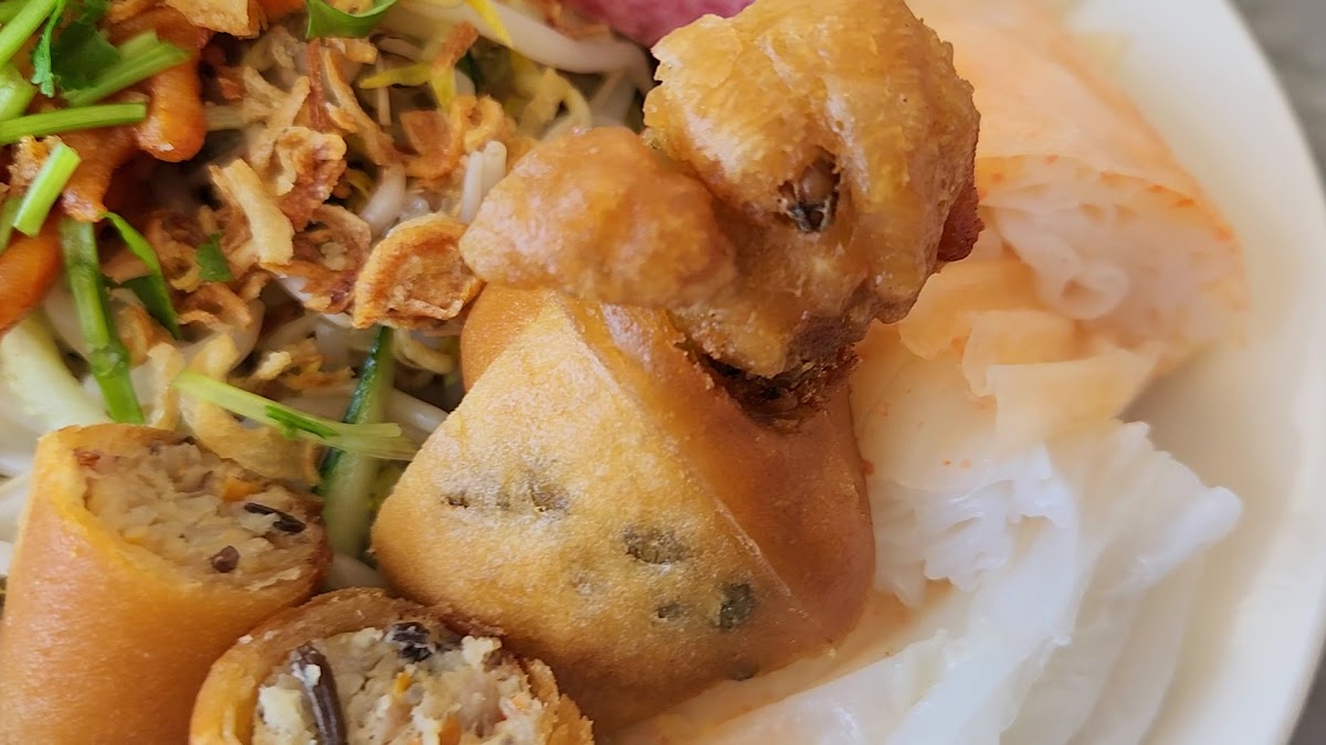 BBQ Pork Vermicelli Bowl with Shrimp Springroll